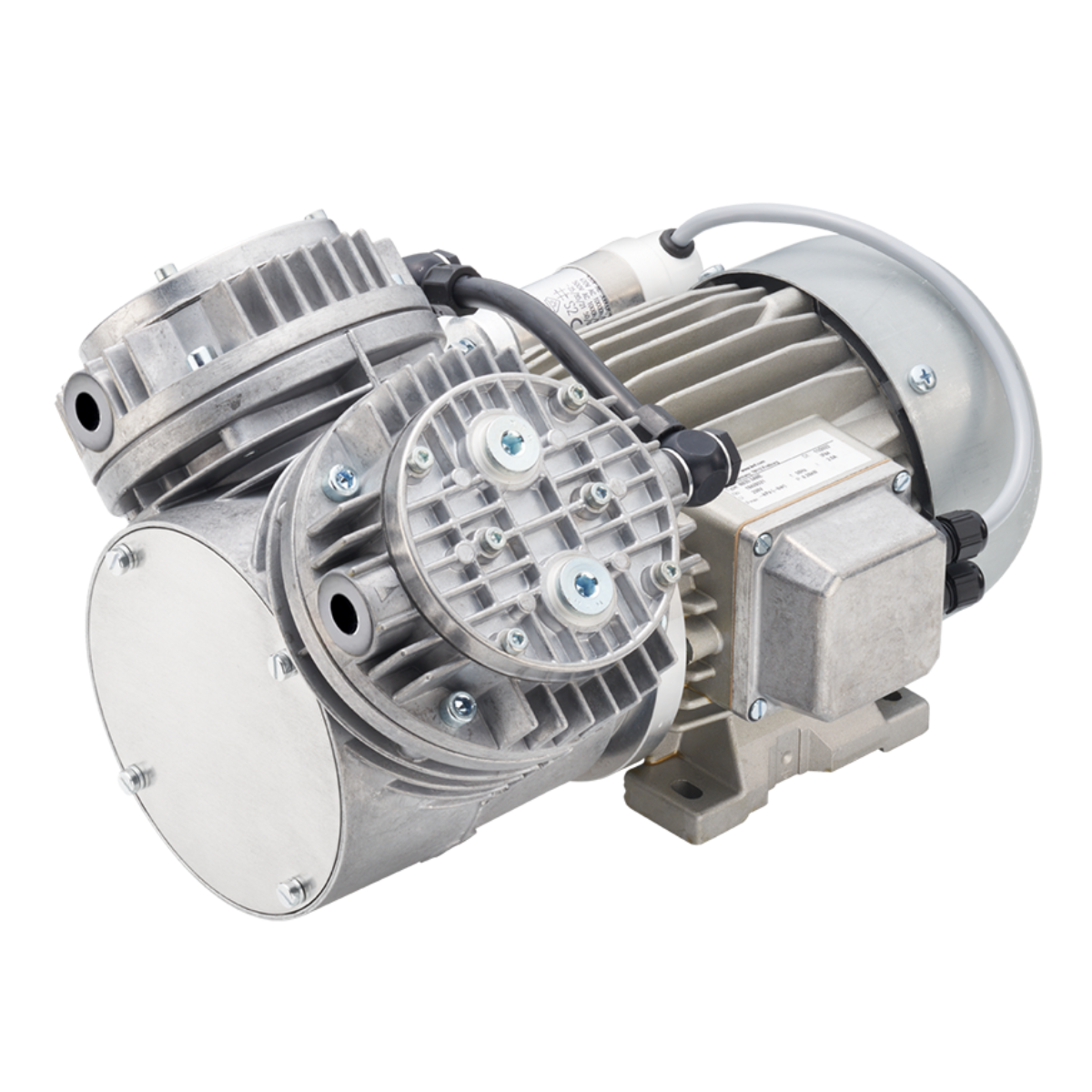 Flow Rate (max.): 100 l/min Pressure (max.): 1.5 bar (rel.) Vacuum (max.): 180 mbar (abs.) KNF diaphragm gas pumps transfer or compress gases and vapours and generate vacuum without contaminating...